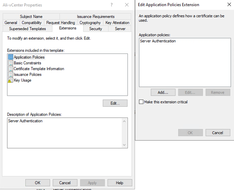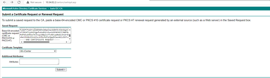 11- Server Request kısmınına vCenter’dan aldığımız “vmca_issued_csr.csr” isimli dosyayı notepad’de açıp buraya kopyalıyoruz. Certificate Template kısmında ise oluşturduğumuz template’i seçiyoruz.