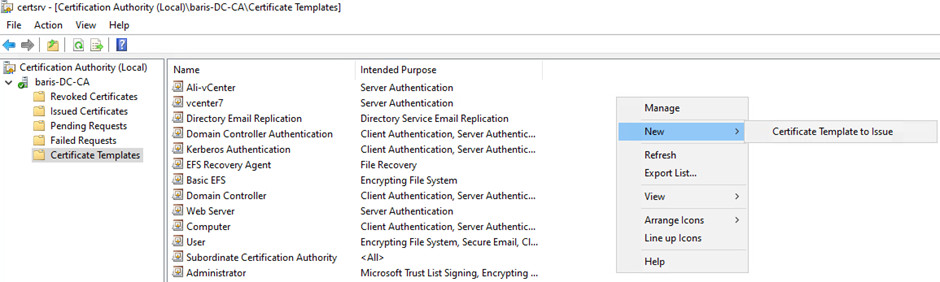 5- Template’i sertifika server’a yüklemek için Certification Authority’yi açıyoruz. Certificate Templates klasörünün içine sağ tıklayıp “New/Certificate Template to Issue” deyip oluşturduğumuz template’i ekliyoruz.
