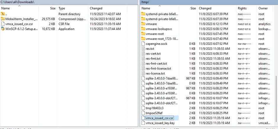 8- WinSCP ile vCenter’a bağlanıp tmp altına oluşturduğumuz “vmca_issued_csr.csr” isimli dosyayı download ediyoruz.