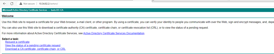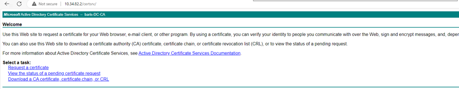 9- Tarayıcı üzerinde sertifika server’a bağlanıyoruz. Certsrv-ip-adresi/certsrv