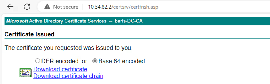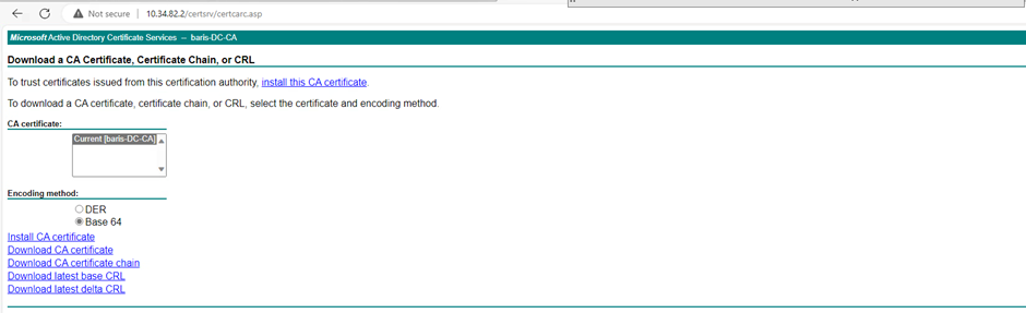 14- Burada “Base 64” seçip “Download CA certificate” seçip sertifikayı indiriyoruz.