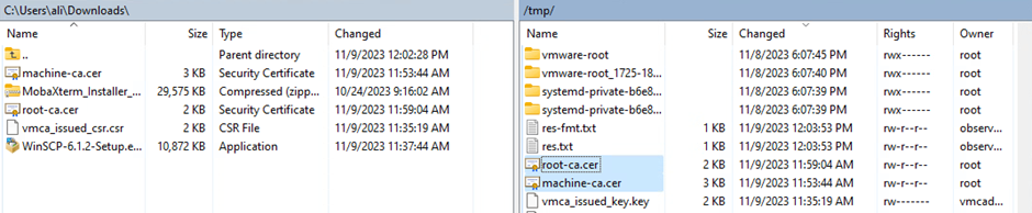 17- Machine-ca ve root-ca’yi winscp ile vCenter/tmp altına atıyoruz