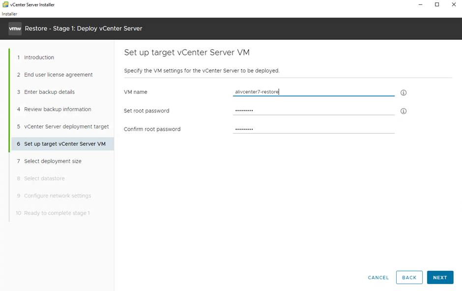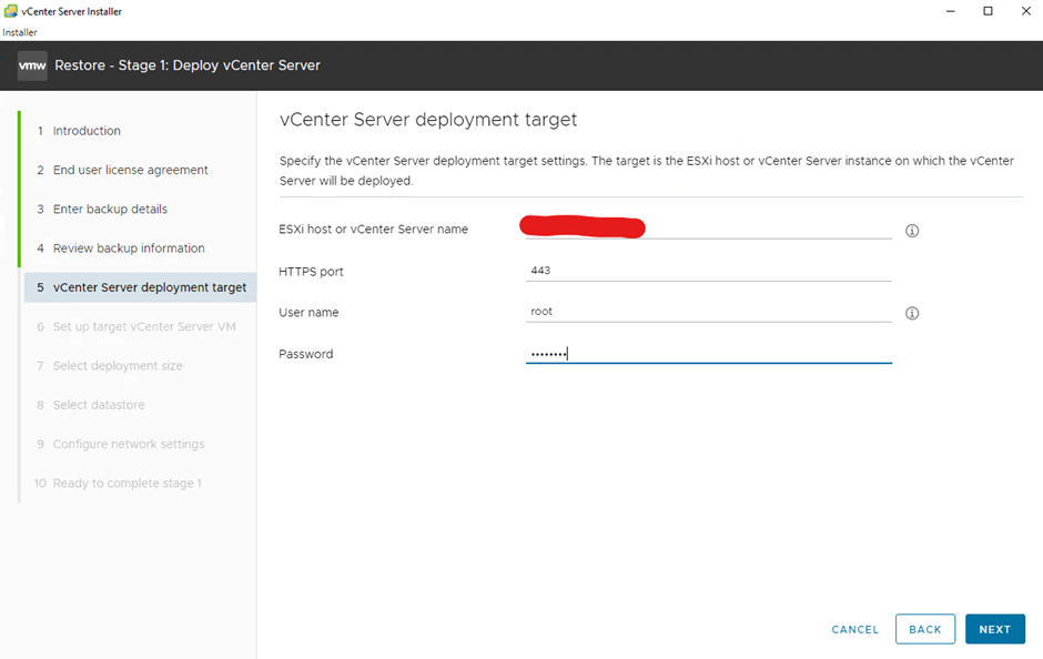 10- Stage 1-6 Restore ediceğimiz vCenter’ın ismini ve root parolasını veriyoruz.
