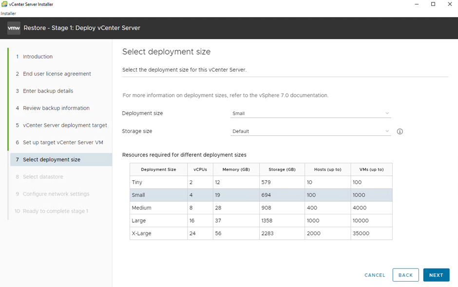11- Stage 1-7 Burada size’ları belirliyoruz. Mevcut vCenter’dan küçük olmaması lazım. Mevcut vCenter’ım small olduğu için small seçtim. Storage size da default’du.